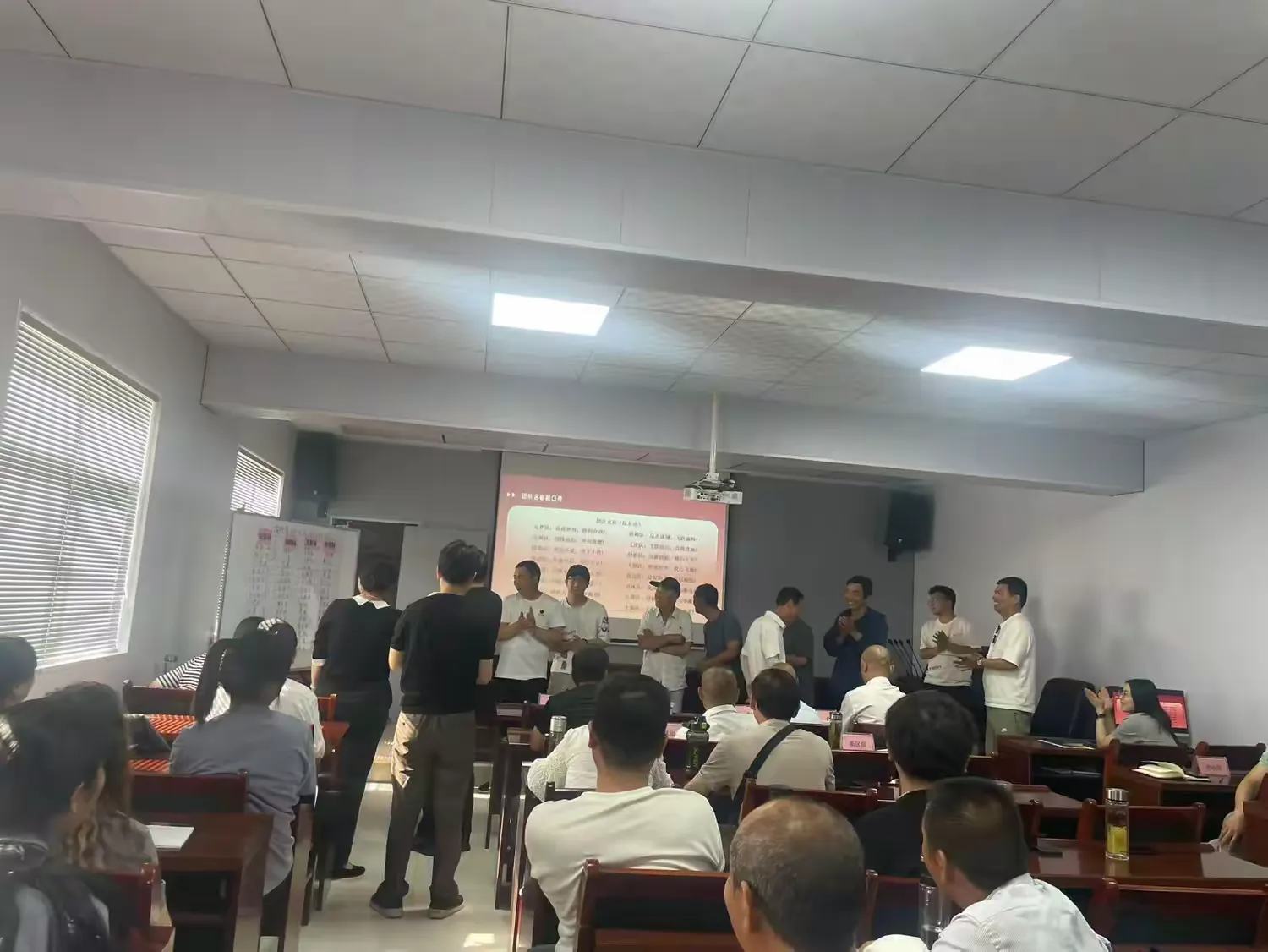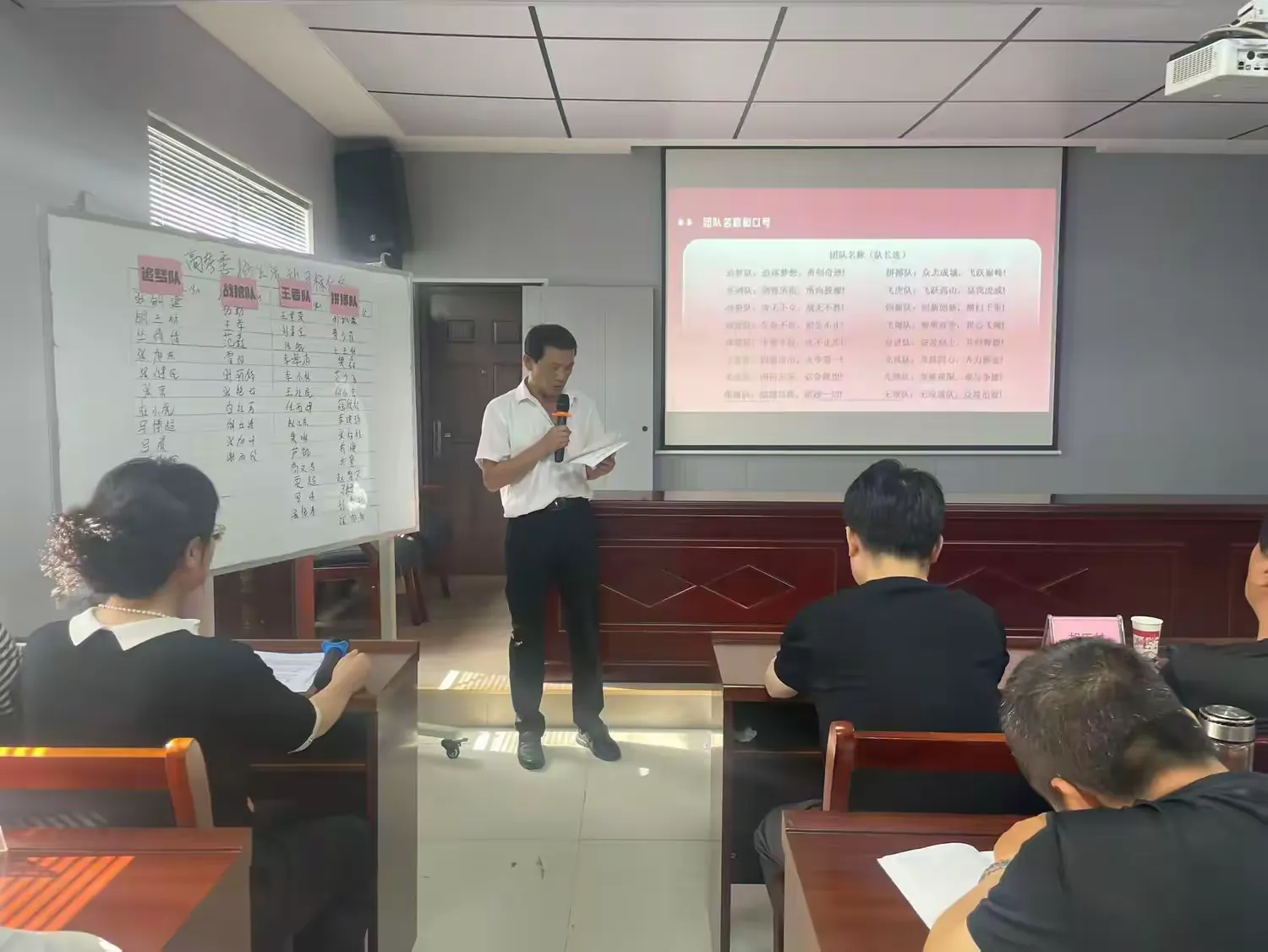 接著,在團隊誓師環(huán)節(jié),總分為四個團隊,各個團隊隊長依次上臺表態(tài)發(fā)言,選出自己的隊名和口號,分別是“追夢隊”“戰(zhàn)狼隊”“王者隊”“拼搏隊”,并立下“破紀錄、創(chuàng)佳績”的軍令狀。隊員們現(xiàn)場紛紛書寫目標任務,“王者隊”隊長王華榮“沖刺40單”“拼搏隊”隊長孫銅森“沖刺25單”等字樣彰顯必勝決心。各戰(zhàn)隊喊出自己的口號“追逐夢想,勇創(chuàng)奇跡”“攻無不克,戰(zhàn)無不勝”“四面出擊,永爭第一”“眾志成城,飛躍巔峰”等鏗鏘口號,將現(xiàn)場氣氛推向高潮。
