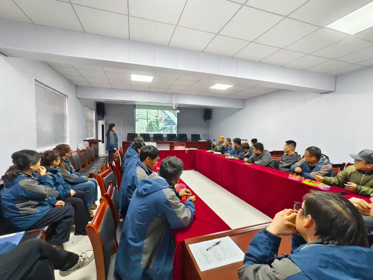 活動(dòng)現(xiàn)場(chǎng)被精心裝扮一新,溫馨的生日大屏、精美定制的生日禮物、精致的生日蛋糕與香甜的茶點(diǎn)整齊擺放,現(xiàn)場(chǎng)還設(shè)置了專屬PPT與播放大屏,循環(huán)播放著精心制作的視頻。視頻中收錄了5位壽星日常堅(jiān)守崗位、認(rèn)真工作的精彩瞬間,一張張專注的臉龐、一幕幕忙碌的身影,既是大家辛勤付出的真實(shí)記錄,也是駕校最溫暖的風(fēng)景線,讓整個(gè)會(huì)場(chǎng)更具儀式感與紀(jì)念意義。
